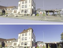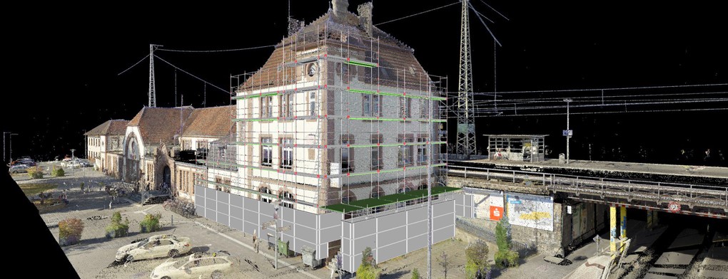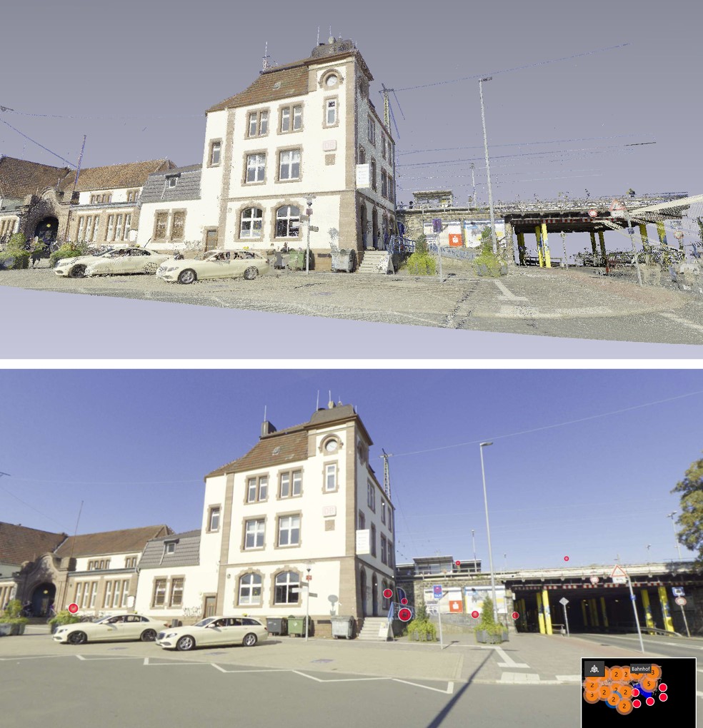 Die Galeriebilder zeigen eine Digitalisierung eines Bahnhofs in Fotoqualität sowie als Vergleich das mittels einer Punktwolke erstellte 3D-Modell. Die erstgenannte Datei führt einen bspw. mittels Ansprungpunkte (im Bild rechts unten zu sehen) zu den jeweiligen Standpunkten innerhalb dieser 3D-Szenerie. Die Situation / die Gegebenheiten können also von verschiedenen Punkten aus am Rechner betrachtet werden.