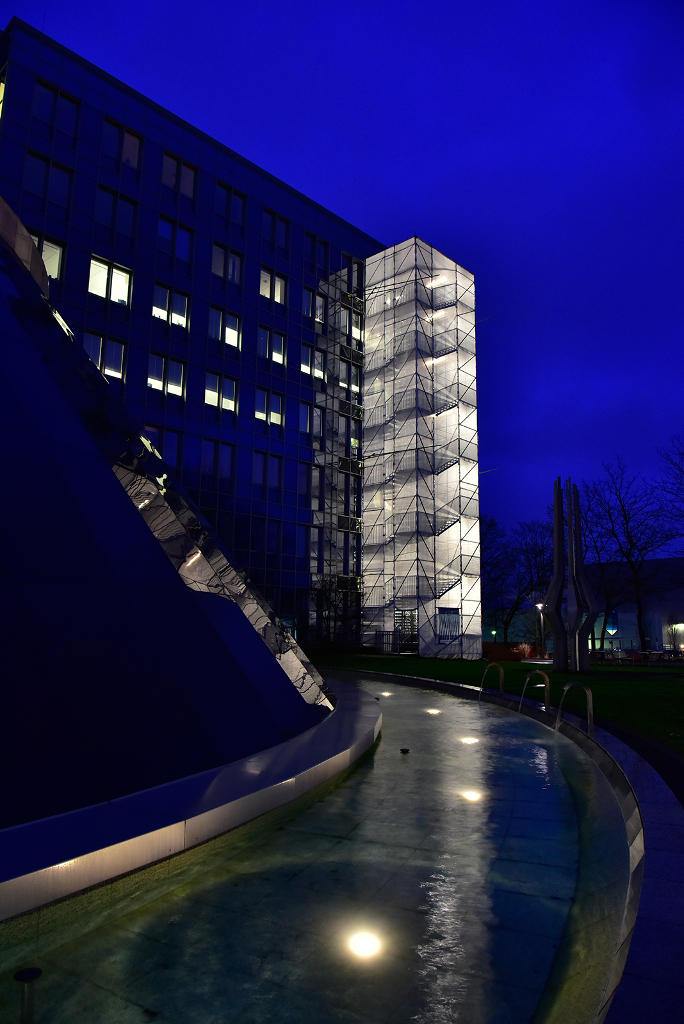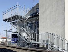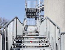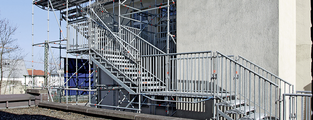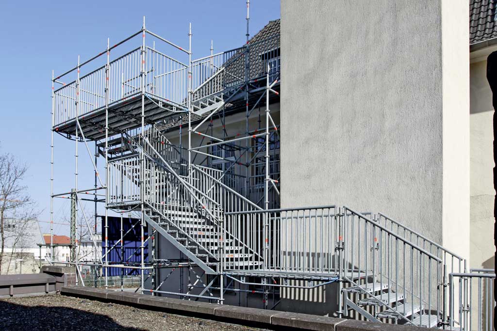 - temporärer 2. Flucht- und Rettungsweg DIN18065 in Gerüstbauweise (gemäß der jeweiligen Landesbauordnung (LBO) sowie deren untergeordneten Richtlinien, wie bspw. der Schulbaurichtlinie (SchulBauR), der Sonderbauverordnung (SBauVO), der Versammlungsstättenverordnung (VStättVO))