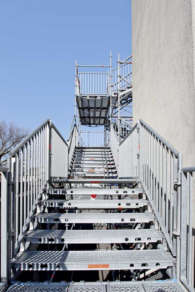 - Bautreppen gemäß Betriebssicherheitsverordnung (u.A. TRBS 2121) wie z.B. die leichte, einteilige Podesttreppe aus Aluminium für den komfortablen Aufstieg im Gerüst oder die Rohbautreppe als Bautreppe
